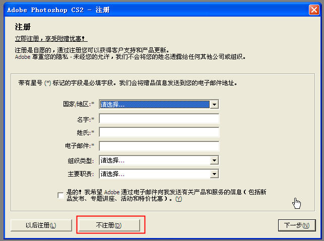 5、首次运行photoshop cs2会要求进行网上注册,按下“不注册”即可。