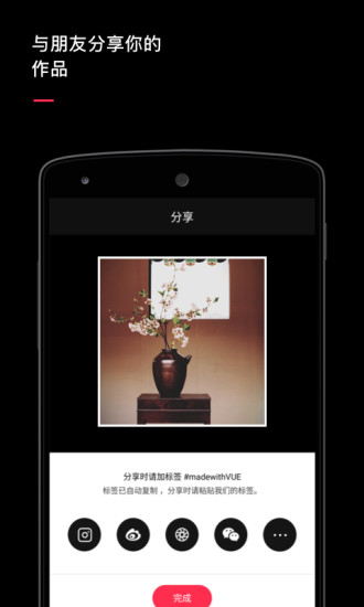 vue视频相机是受过小众软件、Appsolution、最美应用、极客公园、挖 app、Pingwest、Technode 等一线科技媒体倾情推荐过的摄影app;vue现已全面适配微信朋友圈短视频,竖屏全屏效果在朋友圈展示更富有冲击力,更有超宽屏、圆形画幅等可供选择。前置摄像头自带美颜功能,展示你360度的美,快来拍摄十秒视频分享至朋友圈吧!