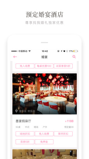 婚宴酒店:预订婚宴酒店,享受免酒店入场费、免押金、草坪使用折扣、茶坊打折等实际性优惠。
