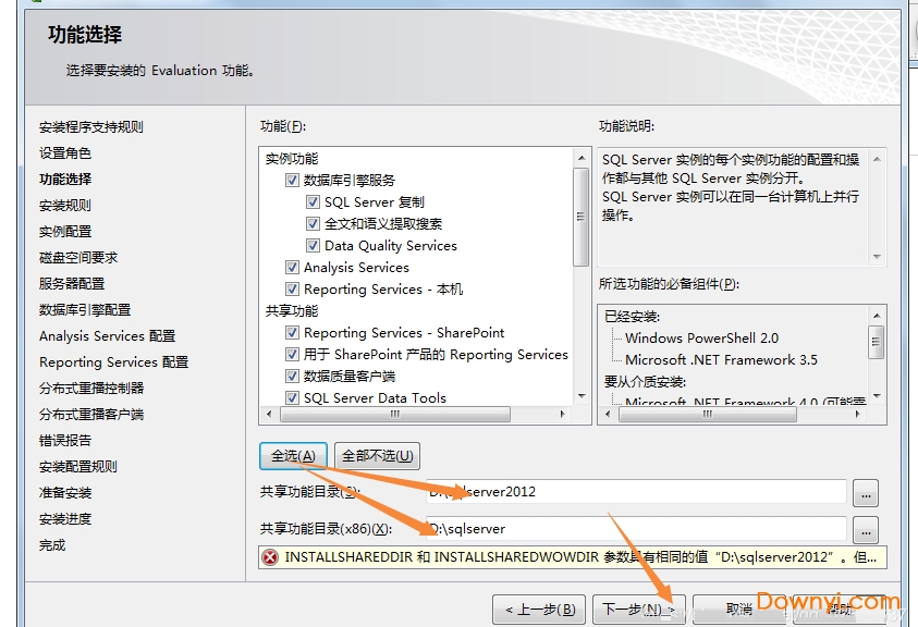 建议全选;由于SQL占用空间较大,本机修改了功能目录存储位置;