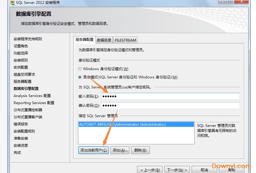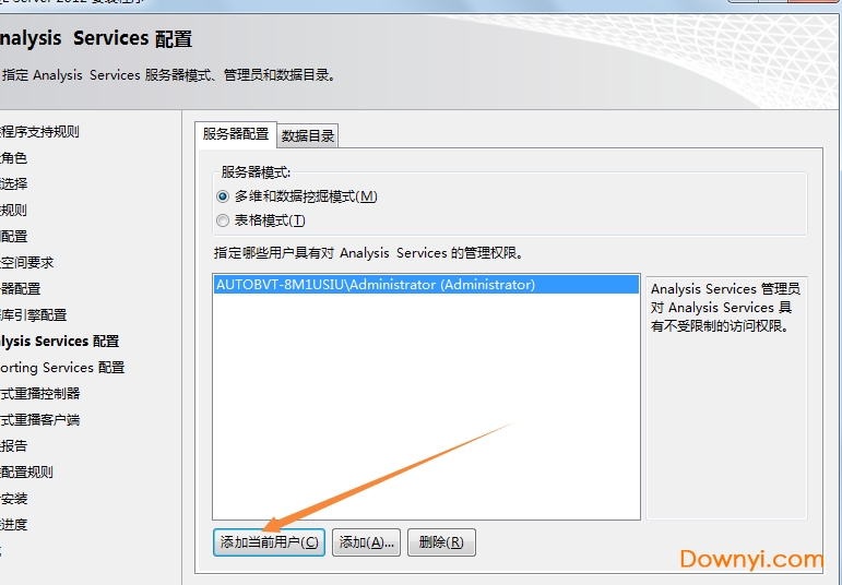 Analysis Services配置,选择“添加当前用户”;