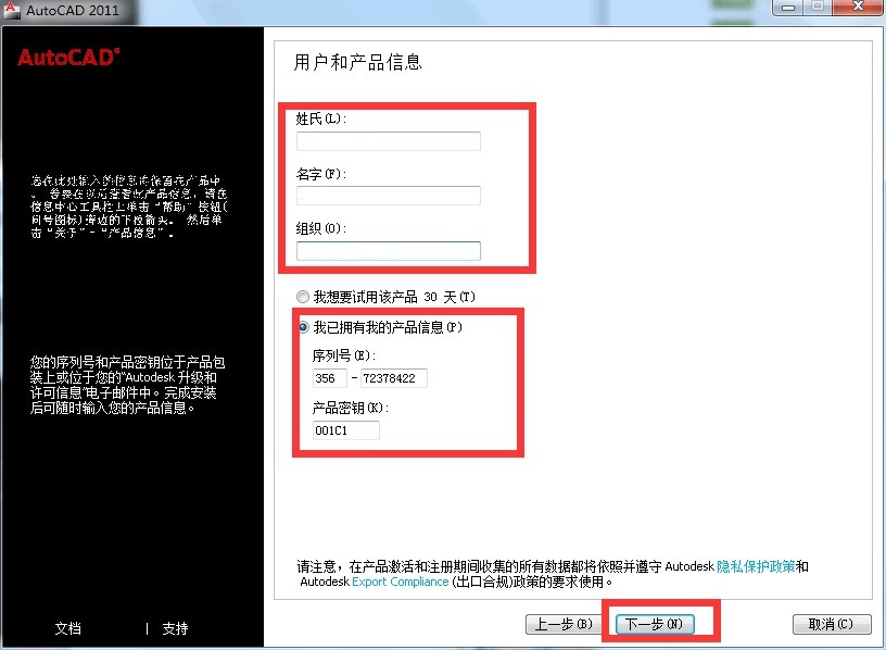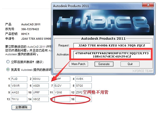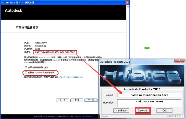 8.将得到的激活码粘贴到AutoCAD2011的注册窗口中,粘贴后的激活码会空两格,这个是正常的,不用管,直接“下一步”