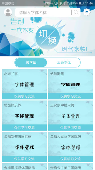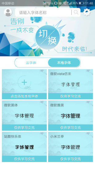 字体管理是一款十分实用的手机字体软件,软件的功能非常强大,能够不需要root 的情况下自由随意的切换手机字体,用户可以通过这款软件找到适合自己的手机字体然后进行切换使用,同时这款字体软件还能够自行的添加手机本地字体。用户可以自制字体然后进行使用。