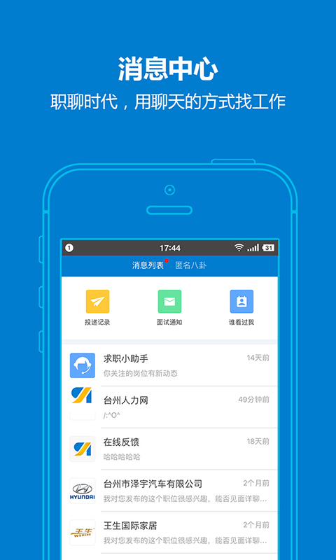 台州人力网app利用lbs定位技术分析并匹配出附近的工作,让更多的求职者能够找到离家近的职位。通过大数据分析访客、面试、关注,三个与求职者强关系的数据一目了然的展示,突出了职业生涯的过程,累加,沉淀。