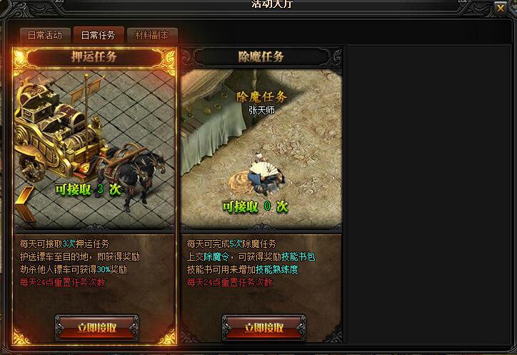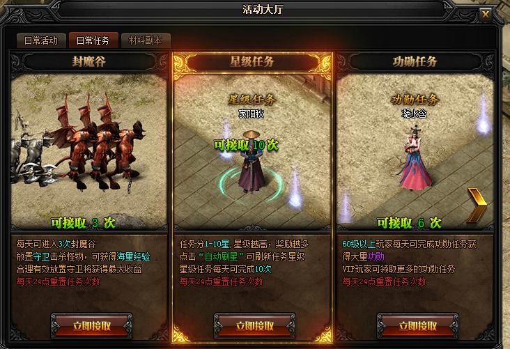 分别是:封魔谷、星级任务、功勋任务、押运任务、除魔任务。任务和vip等级不同,每天可进入的次数也不同。