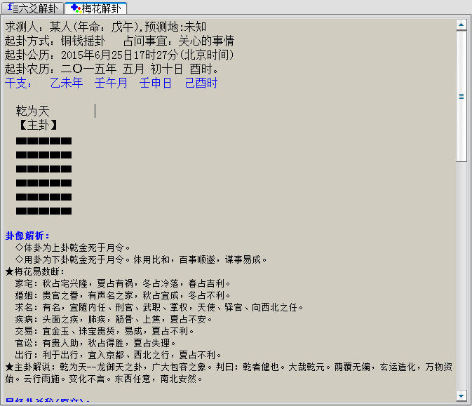 六爻排盘软件是一款卜卦算命软件;拥有三六爻解卦与梅花解卦两种侧卦模式,通过该软件,可以算财运,生意,天气,考试,疾病等,软件支持铜钱起卦、时间起卦、数字起卦等功能,用户可以根据自己的需要进行选择,使用其中的诸葛神数,还能进行测字解签,帮助您查询姓氏,名字,今日吉凶等,是一款难得的周易排盘软件。