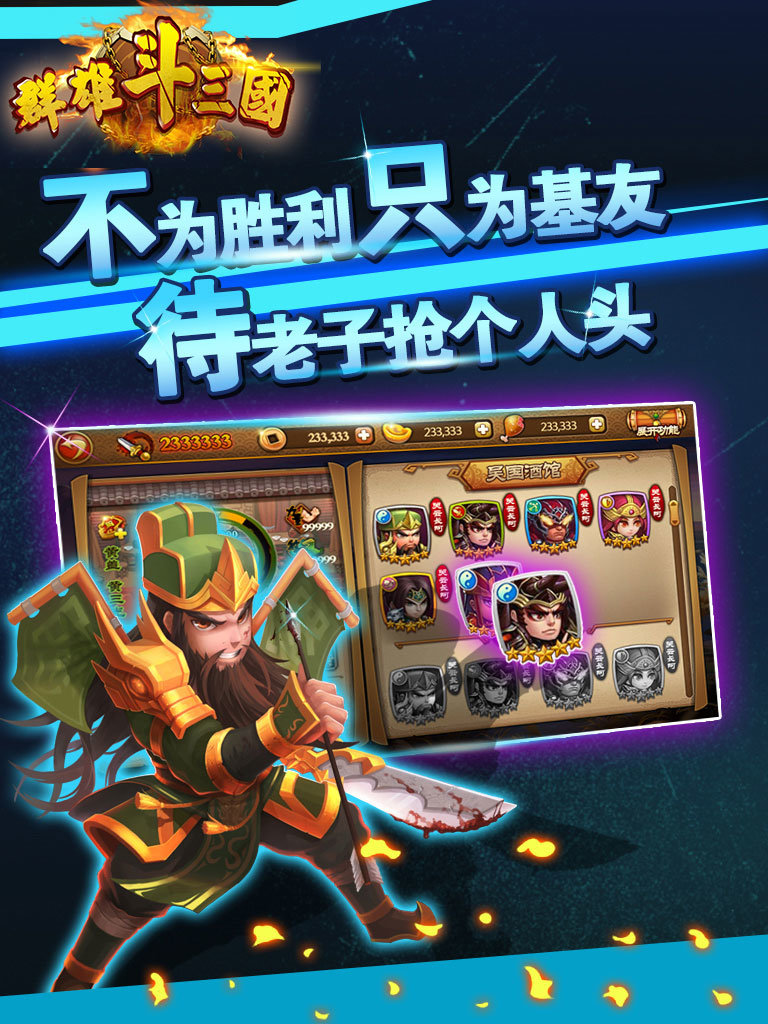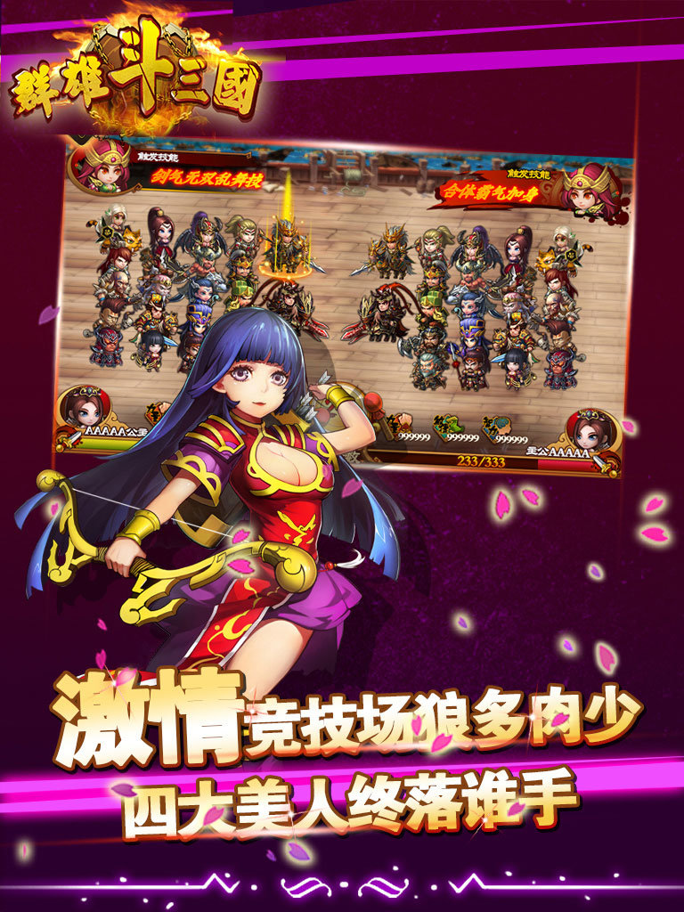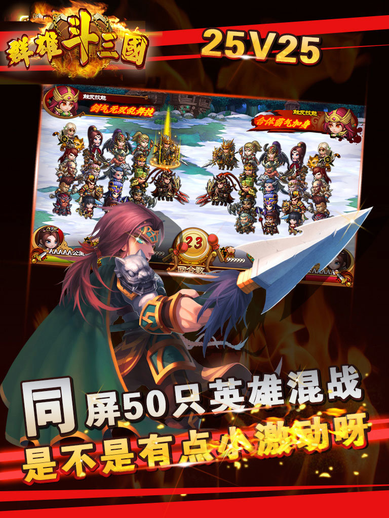 群雄斗三国手游是一款Q版的三国题材手游,游戏的画面非常的精美,人物具有高度的三国特色,一个屏幕可以同时参与数十个英雄大混战,打斗场景激烈,玩家能感受到三国时期的热血战争,刀光剑影,令人热血澎湃。快来下载试用吧!