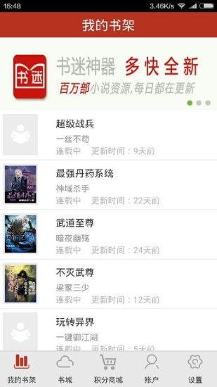 书迷神器是一款手机电子书阅读软件,这款软件可以随时提醒你正在追看的网络小说的最新章节,智能的更新提醒功能让你不再错过任何一次新章节,喜欢看网络小说的朋友就来体验吧。