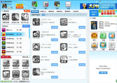 边锋网络游戏世界大厅,目前已开发的各类棋牌游戏总和达 100 多种,主要分为牌类、棋类、骨牌类、休闲类及大型网游类;人们熟知的斗地主、升级、各地麻将、围棋、四国军棋等,更是聚集了不少发烧友玩家。边锋游戏以浙江为起点,用户辐射到东三省、四川、福建、长三角等全国各地。