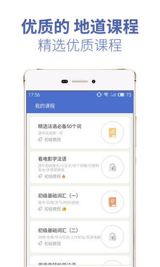 精选法语必备50词,进阶至法语初级基础词汇三部曲,更有看电影学法语等各类场景专题课程。从词,句,对话学习,循序渐进,轻松学法语,媲美沪江开心词场!