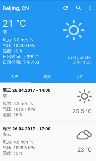 3.可按照城市显示今天、明天和未来一星期的天气温度、风力、气压、湿度、日出时间、日落时间等内容。