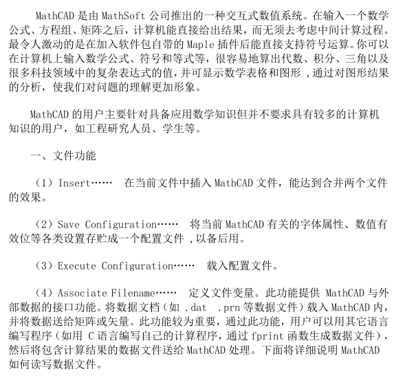 (4)Associate Filename…… 定义文件变量。此功能提供 MathCAD 与外部数据的接口功能。 将数据文档 (如 .dat .prn 等数据文件) 载入 MathCAD 内,并将数据送给矩阵或矢量。此功能较为重要,通过此功能,用户可以用其它语言编写程序 (如用 C 语言编写自己的计算程序, 通过 fprint 函数生成数据文件) ,然后将包含计算结果的数据文件送给 MathCAD 处理。下面将详细说明 MathCAD如何读写数据文件。