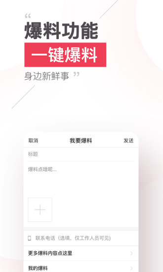 随时随地上传相关事件的照片和文字,一键爆料身边新鲜事,千人爆料团等你来加入,更有红包等你领取。