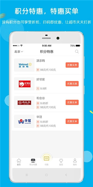 4.【超市优惠】:通过折扣兑券、优惠买单功能支持在超市购物时打折,天天为您省钱;