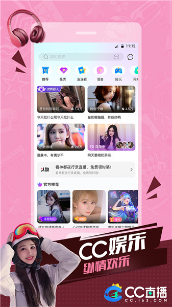 美女秀场、娱乐直播精彩不断:上万名优质主播资源,肤白貌美大长腿、热舞女神、音乐才子、撒娇小萝莉、喊麦大神、搞笑谐星等好看停不下来!下载cc直播,和主播视频聊天,实时互动!