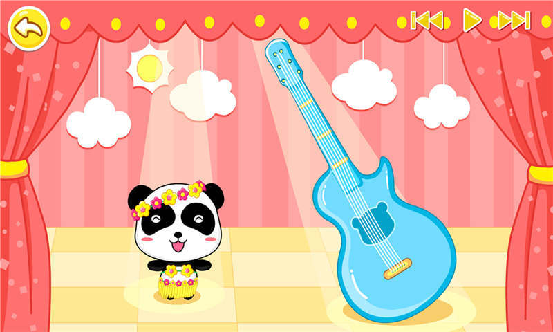 吉他:炫丽的舞台上,小熊猫随着音乐翩翩起舞,点击舞台上方的装饰物,让你惊喜连连!