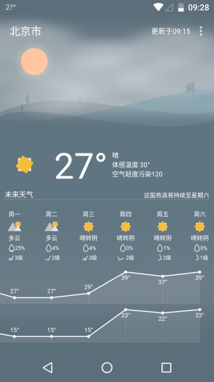 这是一款非常简约和优雅的天气app,拥有暖心的天气展示画面,平稳的天气过度动画。