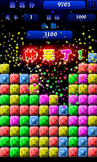 《消灭星星 Pop Star》最流行的消除类游戏,一旦你开始玩,就不会再放手! 《消灭星星》中文版是一个很锻炼脑力的游戏.点击两个或更多相同的星星可以消除它们。消灭星星是一个很锻炼脑力的游戏,和传统的消除类游戏不同,玩家不能再无脑的乱点通关,每一关都会要求达到一定的分数才能通关,否则乱点之后,分数不够,而且也没有可消除的对象就会GAME OVER了,所以说要尽量多得些分数,多个一起消除分数会在基础的分数上进行叠加,不同,玩家不能再无脑的乱点通关,每一关都会要求达到一定的分数才能通关,否则乱点之后,分数不够,而且也没有可消除的对象就会GAME OVER了,所以说要尽量多得些分数,多个一起消除分数会在基础的分数上进行叠加。