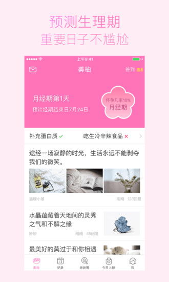 1.美柚以大姨妈月经期管理为切入点,同时为女生提供备孕、怀孕、孕期、育儿、大姨妈月经期、减肥、瘦身、美容、美妆、购物,社区交流等功能。