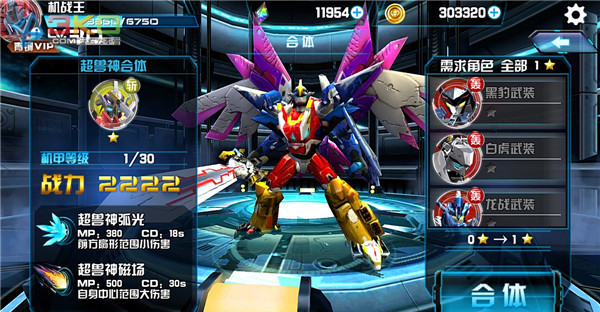 在游戏中,机甲共有4个部分可供调整。分别有:机甲升级、武器升级、机甲进化、机甲合体。目前合体功能暂时还没开放。
