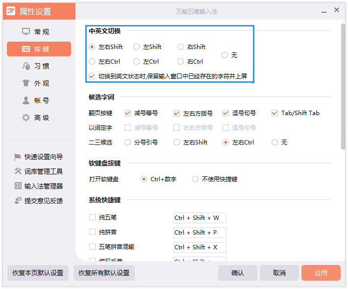 可选择“shift、ctrl"中的任一种,作为中英文切换(也就是显示/隐藏输入条)的热键。