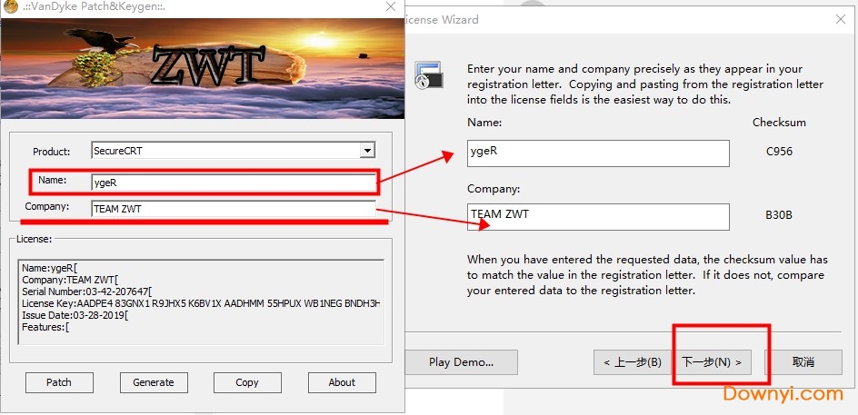 11、再讲将注册机中的Name,Company框中的字符复制到注册界面中的对应框中,点击下一步。