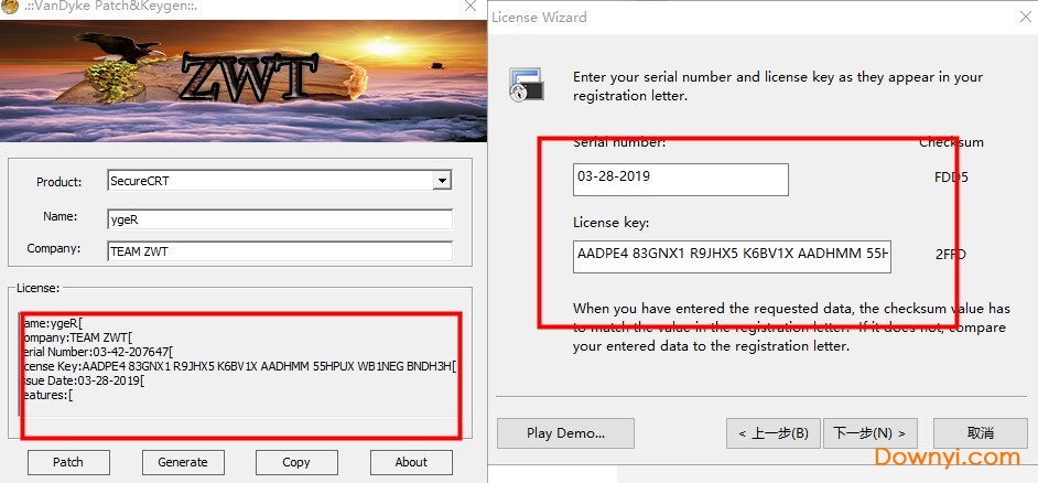 12、再将注册机中的Serialmumber,License key中的字符复制进入注册界面中的对应框中,点击下一步。
