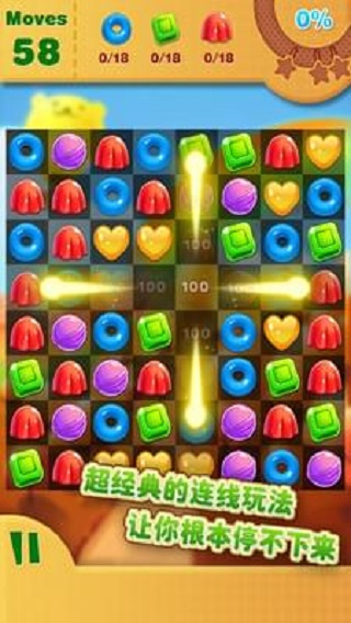 游戏告别传统的对对碰、连连看玩法,采用不同于消灭星星的糖果连线消除模式,玩法上更加灵活多变,玩家可以发散思维自由发挥完成目标。