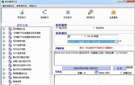 新托福写作王(内含托福写作模版)是一款专门用于突破新托福iBT写作的优秀软件。共分五个强大模块:写作练习、换词练习、打字练习、润句练习及全真模考。帮助你提供丰富的资料,轻松通过托福考试!