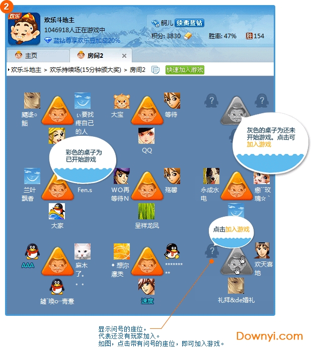 进入游戏房间后,在房间窗口左侧显示有一个个游戏桌,和游戏桌上的玩家。