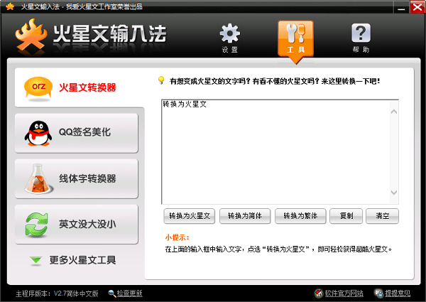 火星文输入法中文版为你提供了可以直接生成火星文的软件,你再也不需要进行可以的修改成火星文了。而且它还与很多其他的功能,比如说将正常的文字批量修改成火星文等等。软件小巧好用,喜欢的朋友快来下载试用吧!