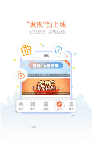 各类业务专区,扫描二维码,语音搜索,在线客服,查找营业厅,投诉建议,网络问题反馈等。