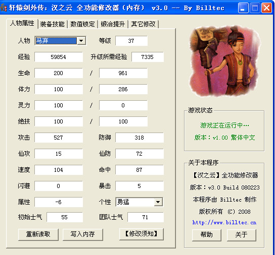 3、新增:为解答网友疑问,添加了内存修改中“人物属性”修改的提示,提醒使用者游戏中人物升级或更换装备可能会使人物各项属性恢复原来数值。