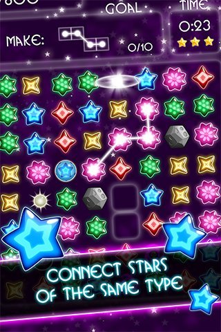 来自全国各地的银河系恒星一起在这个游戏只为你大跌眼镜的乐趣!简单流畅的游戏控制将会使你希望每个弹出后,更多的!只需通过刷卡你的手指在屏幕和连接相同颜色的尽可能多的星尽可能打造星链条!
