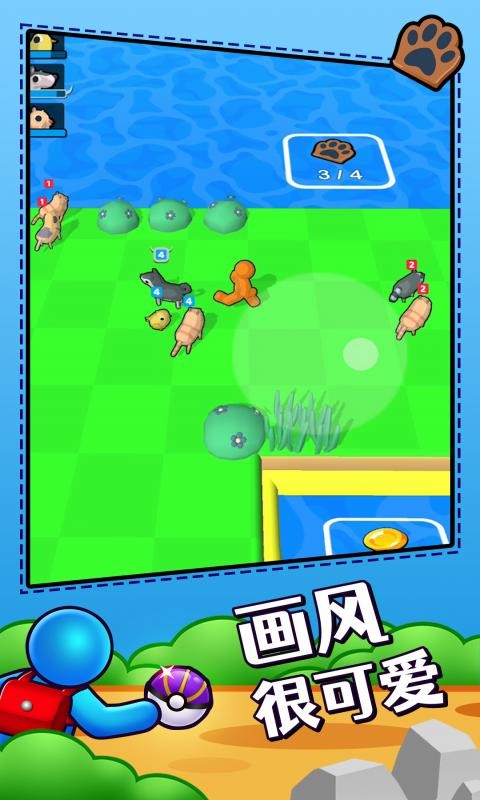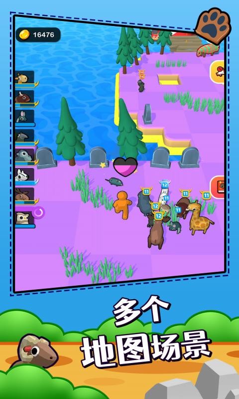 休闲模拟冒险游戏;游戏中玩家需要组建一支动物小队完成冒险,冒险途中会遇到其他动物的攻击,用自己的小队打败它们;玩家还可以在收集喜欢的动物;不同的动物对不同的对手有不同的克制效果,玩家可以多多收集培养来打败各种对手。