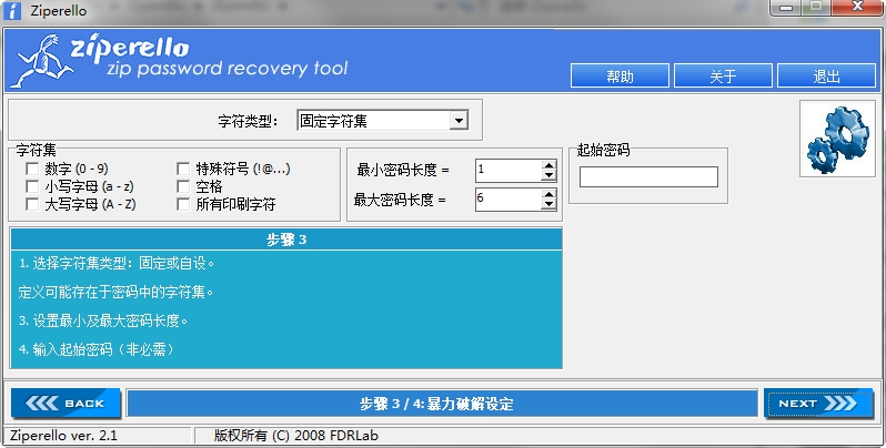 ziperello是用户界面的创建为一个向导,并含有大量的上下文提示。让你充分了解正在发生什么,你应该做的密码搜索过程的每一步。