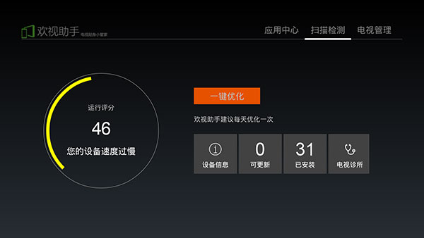 欢视助手tv版是一款由欢视网官方推出的针对安卓电视打造的应用管理软件,你可以通过它来进行清理系统垃圾或者卸载电视中的应用等,而且还提供网络监测和蹭网等功能,是智能电视的必备应用软件,如有需要欢迎来体验使用。