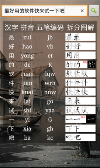 2,功能强大实用,使用简捷方便,特别是编码反查功能具有汉字拆解图,让您轻松学会拆字;