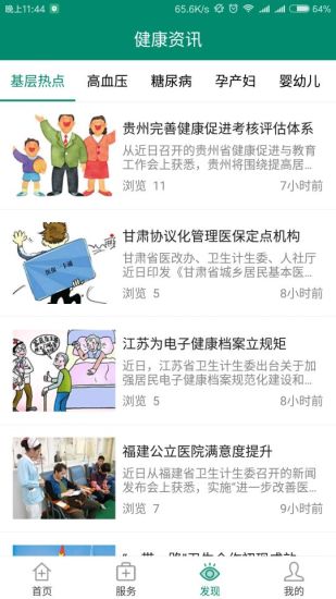 5、发现:可以查看健康咨询内容,包含基层热点、高血压、糖尿病、孕产妇、婴幼儿的咨询文章。