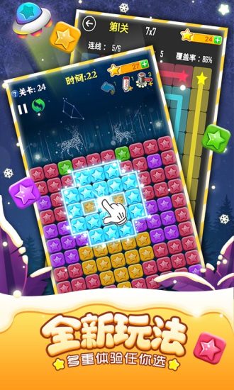 连消星星,通过滑动连接关卡内同颜色的星星,在步数和覆盖率的限制下,增加了玩家消除的紧张度和专注度